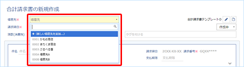 【必須項目】 登録済みの得意先を選択します。 未登録の得意先を入力したい場合は、[新しい得意先を追加]を選択して登録します。 |